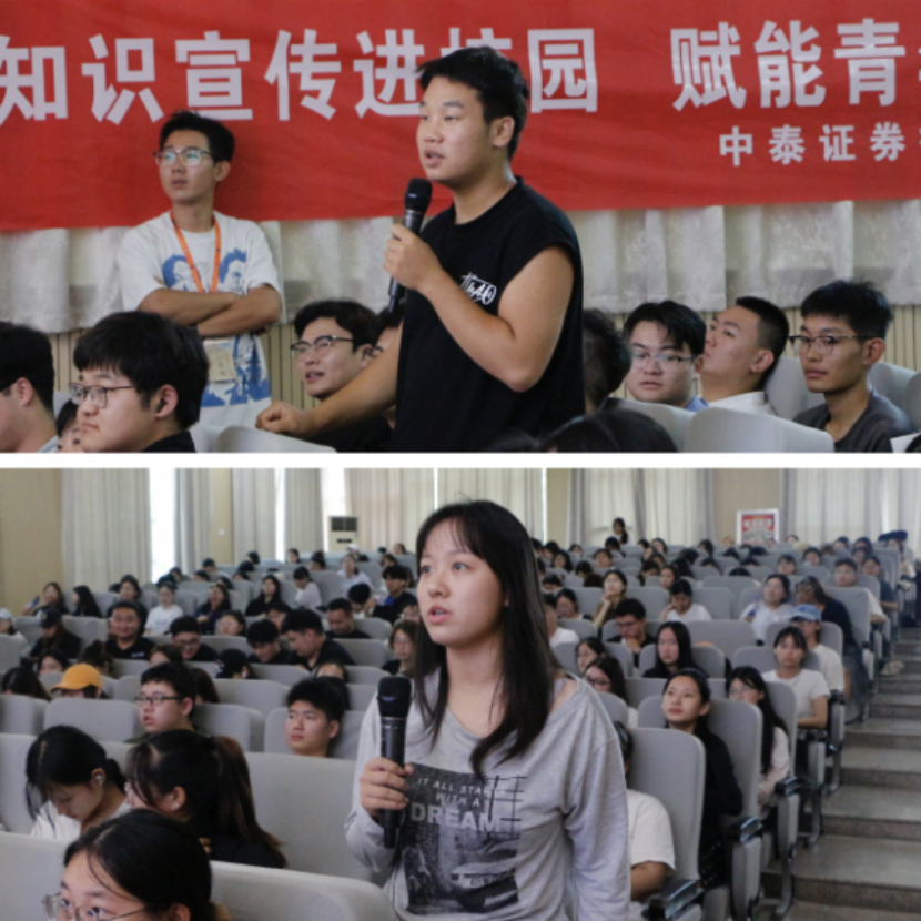 在专题宣讲环节,山东省期货业协会投教部张入文开展了“防范非法期货活动”主题宣讲,通过真实案例揭示非法期货交易的常见陷阱与危害;随后,中泰证券日照分公司讲师陈祥好围绕“金融基础知识——ETF介绍”进行系统讲解,帮助同学们建立对交易所交易基金的初步认知;最后,中泰证券日照分公司王宁带来“防范非法证券活动”专题讲座,警示同学们远离非法证券行为,增强自我保护能力。